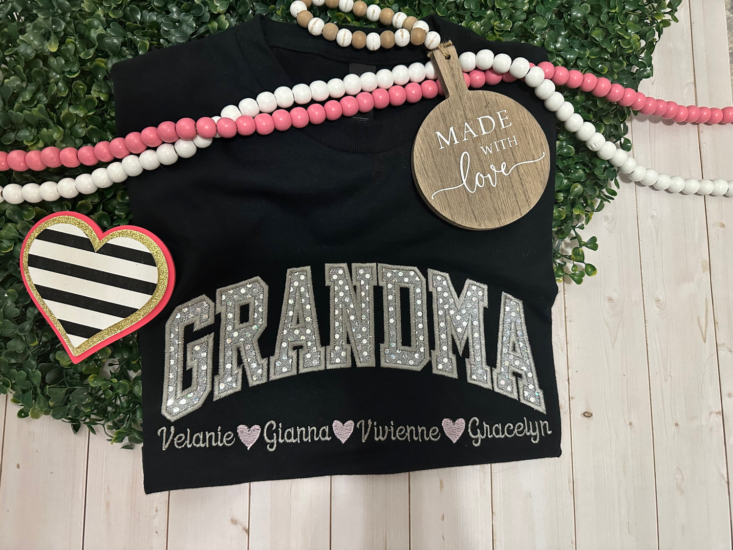 Here’s one of our favorite family pieces stitched here at Texas Threaded Needle. This custom “GRANDMA” sweatshirt sparkles with rhinestone lettering and personalized touches — each grandchild’s name embroidered below with hearts, making it as one-of-a-kind as the family it represents.