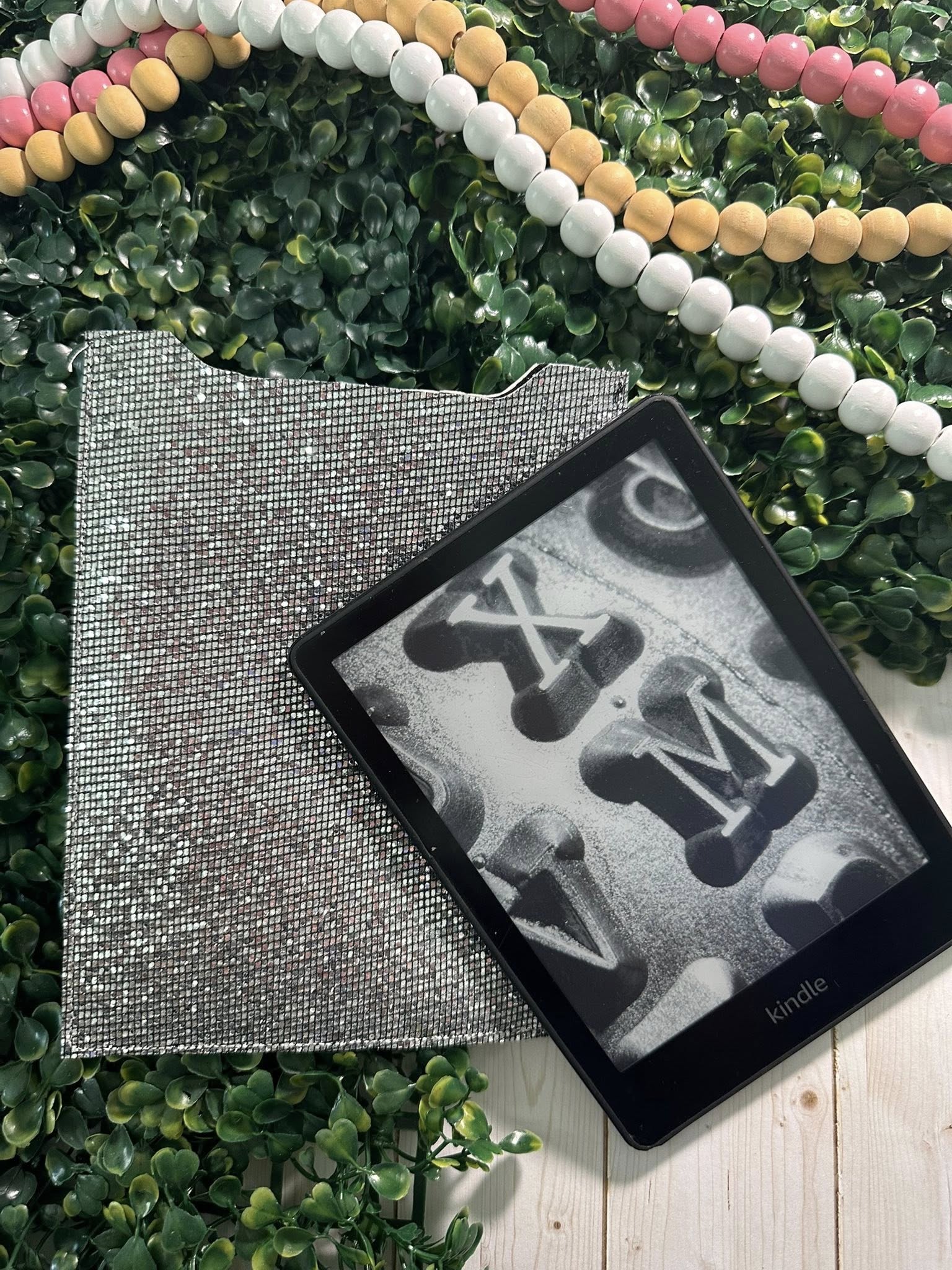 Protect your pages in style. This shimmering silver e-reader sleeve is where function meets flash—offering a snug fit for your Kindle or Kobo while turning heads with its glam, grid-textured sparkle.